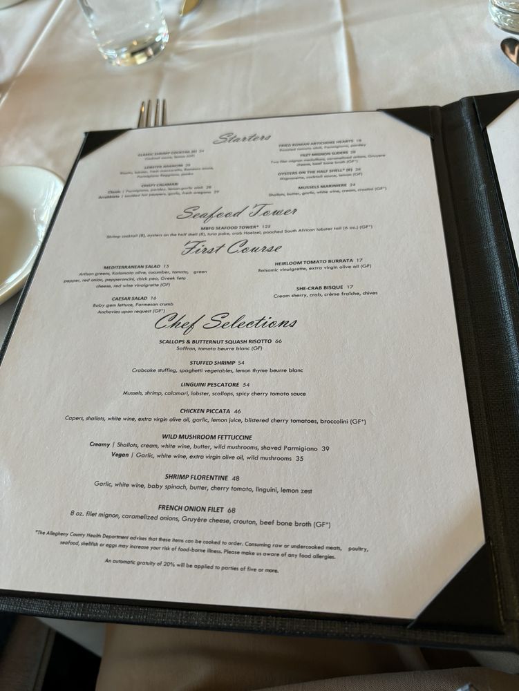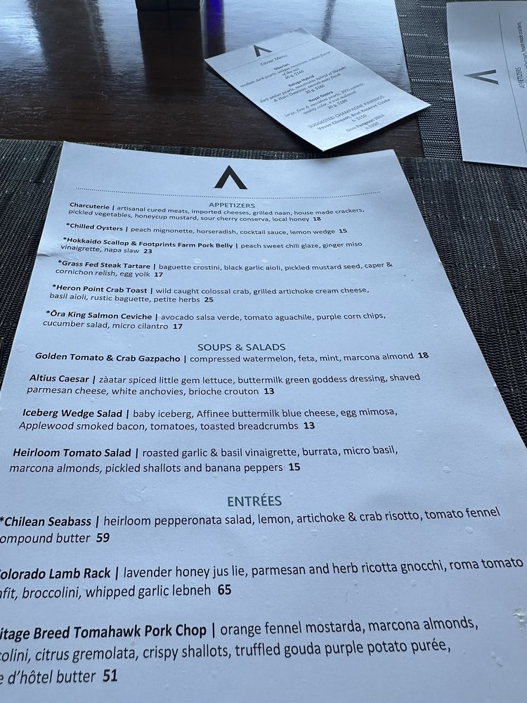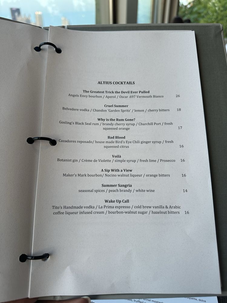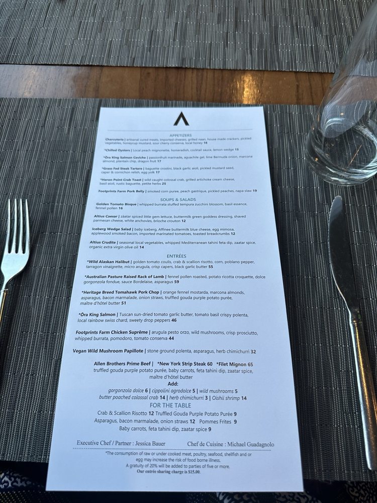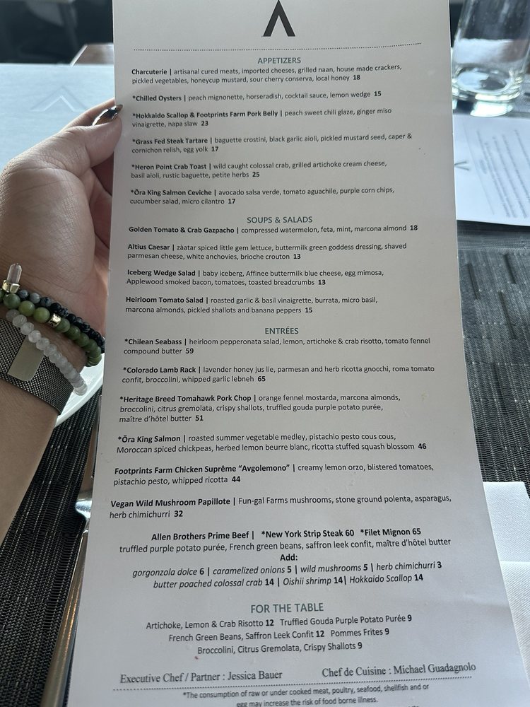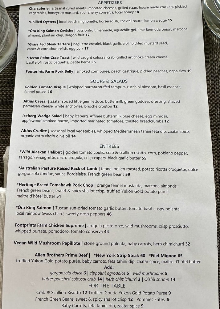 Introducing the menu at Altius, a New American restaurant in Pittsburgh, PA, known for its upscale and classy atmosphere. Offering a variety of starters like Charcuterie, Chilled Oysters, and Ora King Salmon Poke, Altius sets the tone for a fine dining experience. The entrees, such as Line Caught Gulf Black Grouper and Australian Lamb Rack, showcase the chef's attention to detail and creativity. Don't miss out on the delicious sides like Broccolini, Duck Fat Fried Fingerling Potatoes, and Cacio e pepe Risotto. Customers rave about the impeccable service, breathtaking views, and exceptional dishes, making Altius a must-visit for those looking for a memorable dining experience. Whether you're celebrating a special occasion or simply looking to indulge in gourmet cuisine, Altius promises to deliver an unforgettable dining experience.